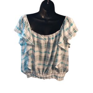 White ruffly shirt with blue & black checkers & elastic around the waist. New with tags & new with tags condition.