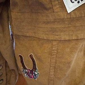 brown light weight corduroy jacked has been recycled by making a large heart pocket on the front out of a vintage quilt. A handmade peace sign cut from the same quilt and several really nice patches....