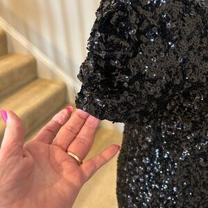 Sparkling mini dress with v neck and low back 100% polyester Hand washable Gathered shirt sleeves In excellent condition