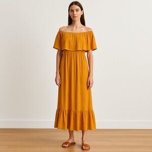 Effortlessly chic Anaak off-the-shoulder maxi dress in a rich mustard yellow hue. Features a soft cotton gauze fabric, ruffled overlay neckline, and ruffle hem detail for a breezy, bohemian silhouette. Ethically made in India.