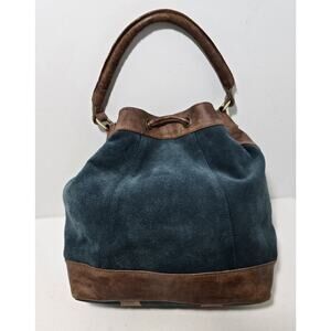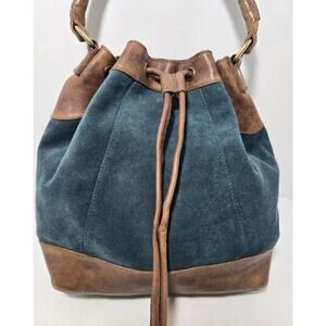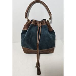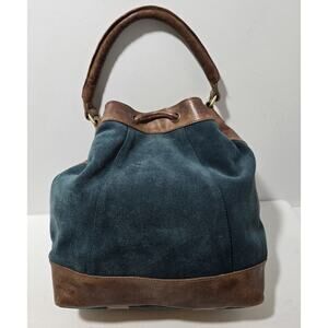Anabaglish Suede/Leather Drawstring Hobo Shoulder Bag Purse Teal with Brown Trim
