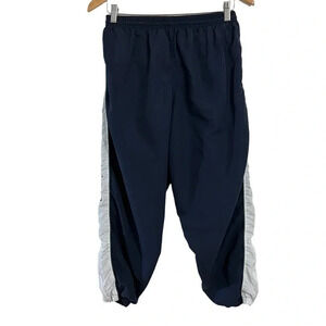 Womens size small, pants, navy blue, white, green, colorblock, multicolor, casual, athletic, gym, workout, pull on, pockets, polyester, machine washable, made in Pakistan, vintage