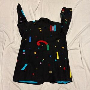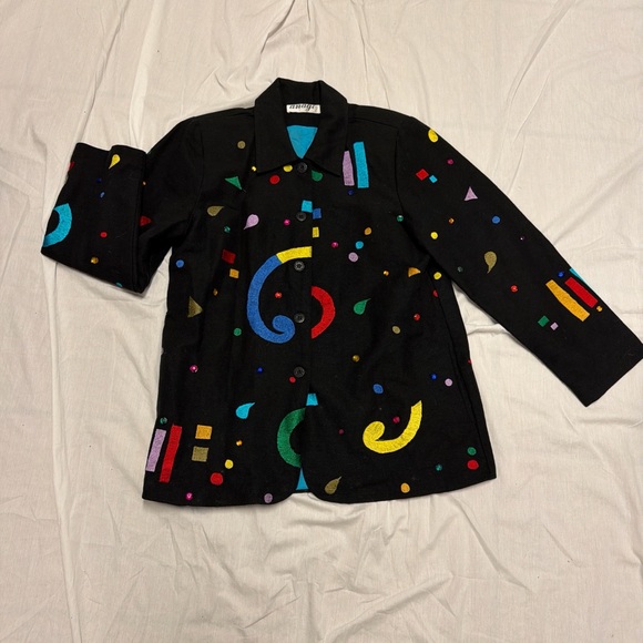 Vintage 90's Black and multi-coloured abstract print button-up jacket with a funky, avant-garde vibe #retrofashion #indiechic by Anage art-to-wear. Size M. Pit to pit 21", Note: stain on lining