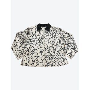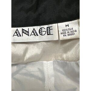 Step into timeless vintage with this rare Anage silk jacket, Size Medium, made in India. Crafted from 100% silk, it showcases bold black embroidery on ivory with a contrasting collar and zip front. A collectible piece from the late 1980s–1990s, it blends lightweight luxury with editorial presence. Perfect with wide-leg trousers, skirts, or styled as a statement over cocktail attire.