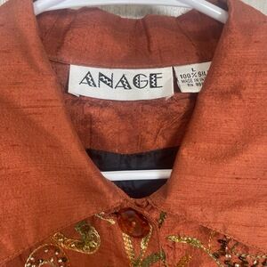 Elegant rust jacket with intricate embroidery. Features a classic collar and button closure. Perfect for adding a touch of sophistication.