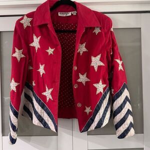 Elevate your wardrobe with this dazzling vintage star-studded jacket! So unique!! Perfect for making a bold statement, this unique piece features glittering star embellishments on a vibrant red backdrop. The eye-catching design is complemented by chic chevron stripes on the sleeves, offering a perfect blend of retro flair and modern style. Ideal for parties, concerts, or adding a pop of personality to any outfit. Don't miss out on this one-of-a-kind find—grab it now and shine bright!