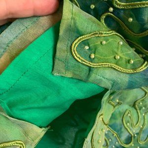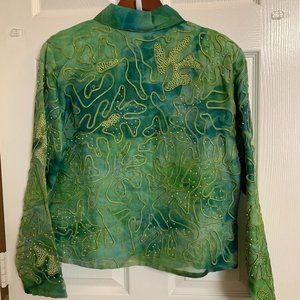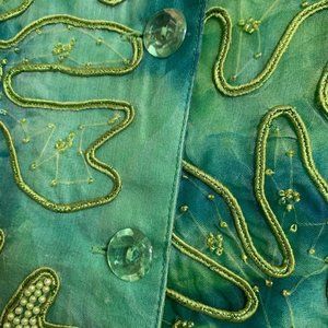 Anage is Women's Premiere Art to Wear Brand. Each piece is unique and one-of-a-kind. This green and blue hand dyed silk blazer is embellished with hand stitching, beading and trims. Gorgeous with a black dress pant or skirt and simple or elegant cami underneath. Wear open or buttoned or a little of both. Great for the theater, a dinner or cocktail party or an art show. You'll be stunning and elegant! Size large and in excellent condition.