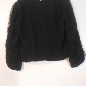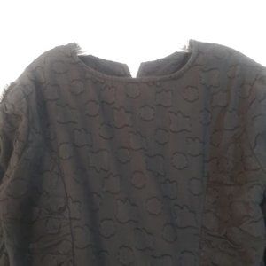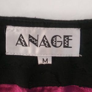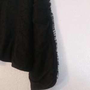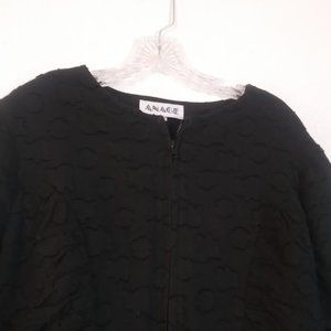 Anage women's size M black jacket, ruched sides, zipper closure, long sleeves, pattern detail throughout, fuzzy arm detail