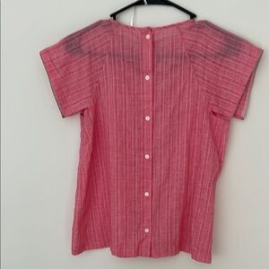 Short sleeve with silver trim accent. Gathered neck and full button back. Semi-sheer. 100% cotton. Designed in New York.