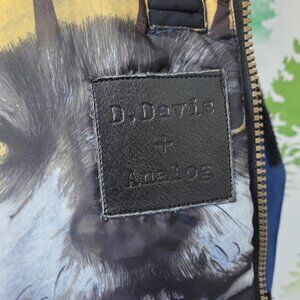 Stylish blue jacket with black shoulder and sleeve accents. Interior lining features a wolf and skull motif. Features a hood and front pockets. Armpit zipper access for ventilation. Perfect for outdoor ski adventures.