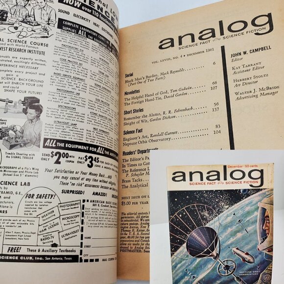 Analog Science Fiction / Fact magazine vintage three issue lot (Dec. 1961, Sept. 1978, Nov. 1978) featuring work by Poul Anderson and more. Intact spines with average overall aging as shown. Ships safely in a sealed padded polymailer w/ cardboard backing :)