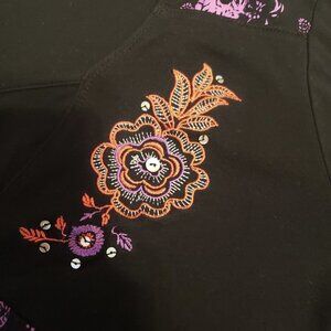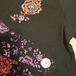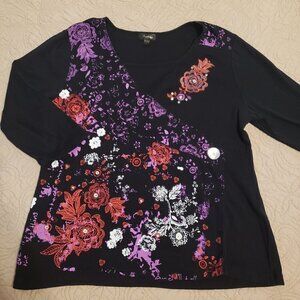Analogy Woman's Top - Size Large. 3/4 Sleeves And Faux Layered Neckline. The Black Tee Is Embellished With Abstract Floral Designs In Purple, Orange, Red And White With Scattered Shell-Like Buttons Of Various Sizes. Measurements taken with the garment laying flat - 20" across the chest / 23" in length.