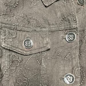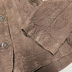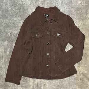 -Chocolate brown corduroy-style jacket with intricate paisley and floral embroidery throughout. Features silver-tone buttons and a tailored fit. Super unique piece with a retro vibe.