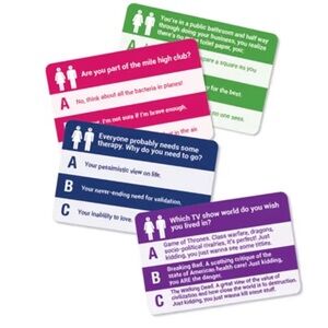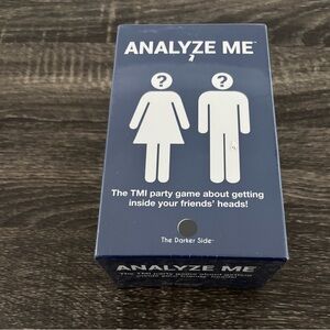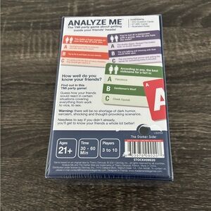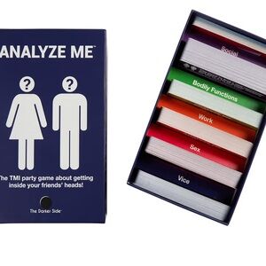 How well do you know your friends? Find out in this TMI party game! Analyze Me is a game about getting inside your friends' heads! Guess how they would react in certain thought-provoking situations in these 5 categories: social, work, bodily functions, vices, and sex! The 220 scenarios have no shortage of cringey humor, secondhand embarrassment and sarcasm. Needless to say if you didn't already, you'll get to know your friends a whole lot better.