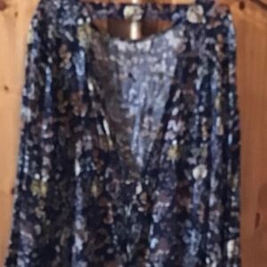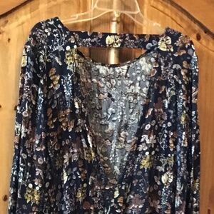 Super Cute! This dress can be worn anywhere, as a tunic with leggings or jeans, or with heels for church or work. Beautiful navy and brown floral print. Scoop neck in front, Very deep “V” back with cross tie at top in back.7” ruffle hem. sleeves, 26”in length from shoulder to end. Dress length 27” from neck to hem. Length is 31” from shoulder to hem.. Pit to pit 18”.Great bargain, really nice dress. Size L but runs small.