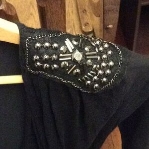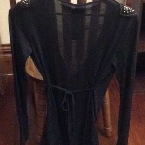 Black Anama long sleeve shirt ties I the back looks like a wrap shirt but is sewn together. Black beaded detail on both shoulders. Juniors size medium.