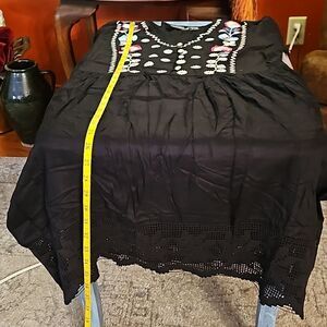 Ananda's Collection Black Embroidered bodice flare skirt dress, 3/4 sleeves 4" Black lace hem, pull on style, size Medium. Johnny Was style. Excellent pre loved condition, measurements in pics, smoke free home, ships next day. Bundle and Save!