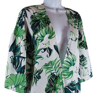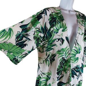 Slip into effortless tropical elegance with this lightweight kimono from Anandas Collection. Featuring a lush green and white floral print, breezy open front, and soft fringe hem, this piece was made for sun-drenched escapes, beachside lounging, or layering over your favorite summer fits. Made in India of soft, drapey polyester with a generous fit that flatters a range of body types.