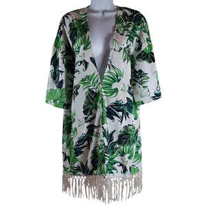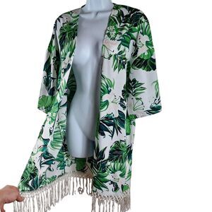 Anandas Collection Green Floral Kimono Cover Up Fringe Hem Free Size Resortwear
