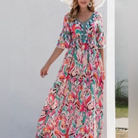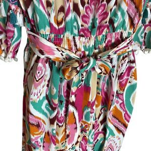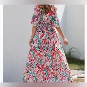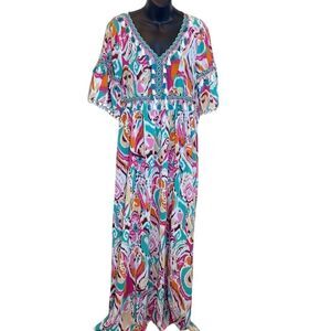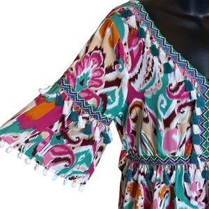 Unlined. Sheer, boutique, maxi, bohemian, colorful, boho, tassel, embroidered, swim cover, cruise, vacation, beach, beachy , tie back, funky, fun, artsy, art to wear, print, sheer, Resortwear, flare sleeve, summer, tiered,