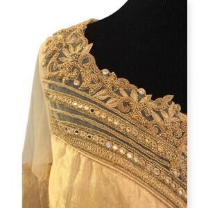 Elevate your ethnic wardrobe with this enchanting Anarkali Suit. Adorned with a Royal Neckline and intricate Gold Embellishment, this outfit exudes timeless charm and elegance.