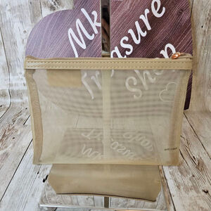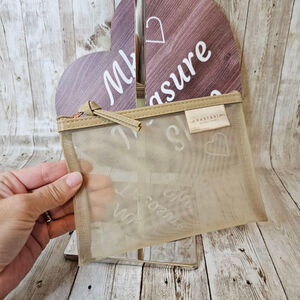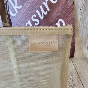 This is a new, unused makeup bag from the brand "Anastasia Beverly Hills." It is made of a beige mesh material with a faux leather zipper . It has a zipper closure and is designed to hold makeup and other small items. The bag is in excellent condition and has no visible imperfections. It comes without tags or a box.