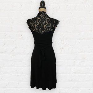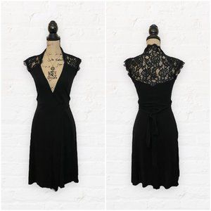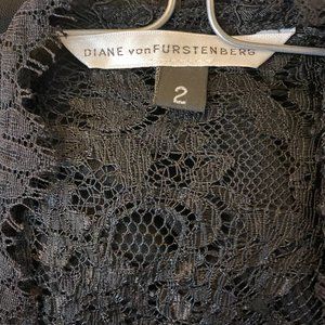 A classic Diane von Furstenberg wrap dress trimmed in delicate lace. The crossover bodice forms a deep V neckline, and a self-belt defines the waist. Short sleeves. Unlined.