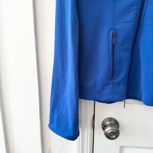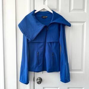 Size small from Anatomie. Style name Lugano. Cobalt bright blue asymmetrical zip front jacket with wide cut collar. Slight belled out sleeve. Scuba like material. Zippered pockets. Preowned in good condition with no stains or tears.