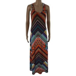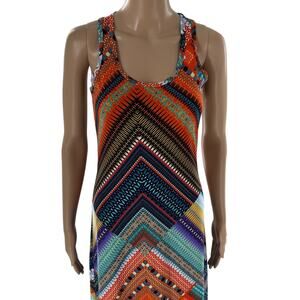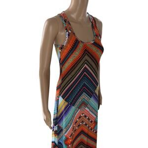 Anatomie Anne orange mango dress with multi colored ikat print all over. Sleeveless. Racerback. Scoop neck. Maxi length. Pulls on. No visible care tag; fabric feels consistent with Anatomie clothing, the polyester blend material ensures both comfort and wrinkle resistance. Made in the USA. In preowned condition.