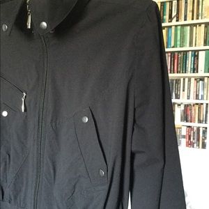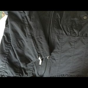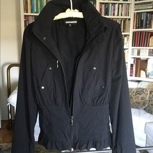 From Anatomie travel wear. Black Rosella ruffle peplum jacket. Hood can be rolled up and hidden under snap-down collar. Two snap pockets, one zip pocket. Mesh lining, zippers at cuffs. Light weight, washable and quick dry, no iron 100% polyester/lycra. Has some stretch to fabric. Fits small at waist so please check approximate measurements: