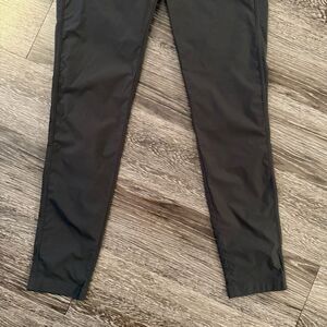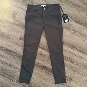 Mid rise, slim fit, wrinkle resistant, pockets, zip fly with 2 snap buttons for closure, brand logo in one of the pockets, very lightweight.