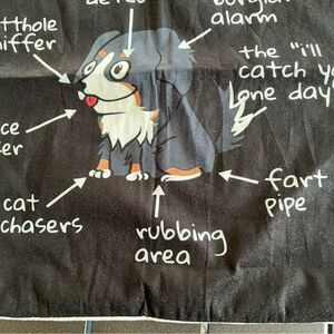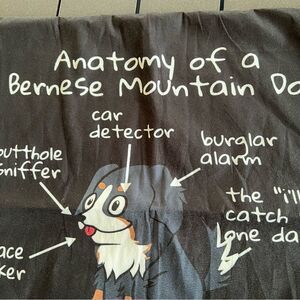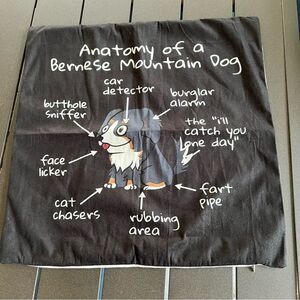This offering is a humorous look at a Bernese Mountain Dog decorative pillowcase. The item is mainly black and white. It is only printed on one side. The pillowcase is 17” x 17”. The item is new.