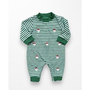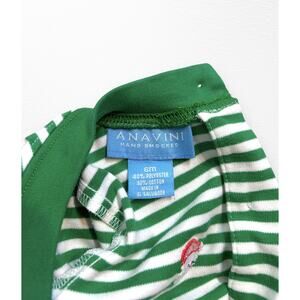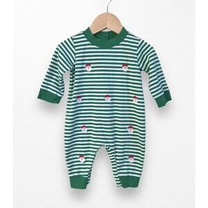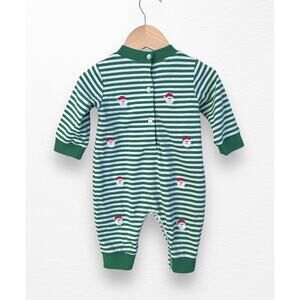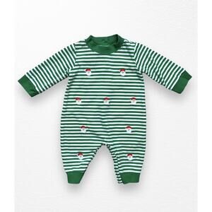 Green and white striped playsuit/romper from boutique brand Anavini in size 6 months. Features embroidered Santa's all over, buttons down the back, and snaps at legs for easy diaper changes. In very good pre-loved condition.