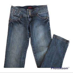 One of my favorites. Skinny leg blues. Size 5/6 inseam 30 1/2” rise 7”