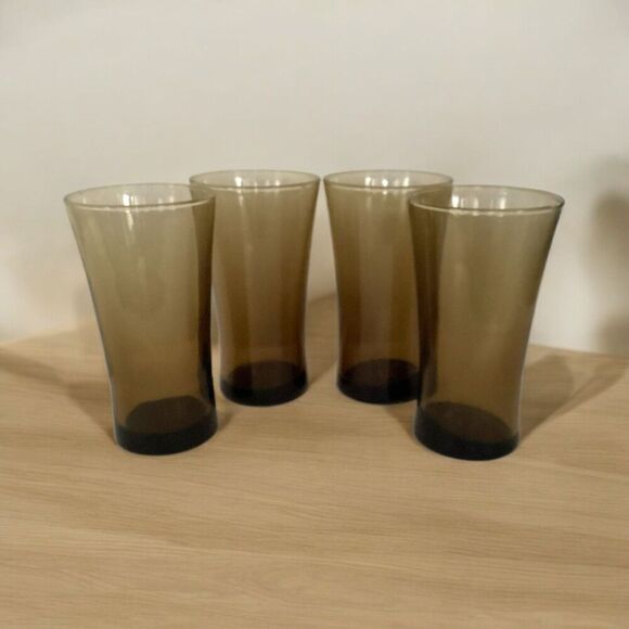 The mid-century modern style and tawny brown color make them perfect for all occasions, adding a touch of retro charm to any table setting. These original, 4-piece tumblers are a great addition to any collection of vintage glassware.