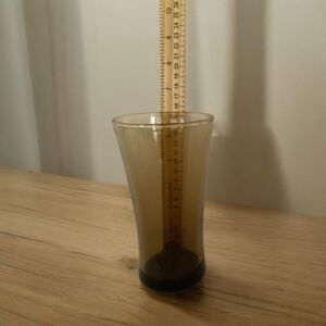 The Anchor Hocking 16 oz Linden "Mocha" Tawny Brown Flat & Flared 4 Glass Tumblers are a vintage set of geometric-shaped drinking glasses from the 1970s. Made of pressed glass, these tumbler glasses have a capacity of 16 oz and a height of 6 inches with a diameter of 3 1/2 inches.