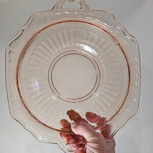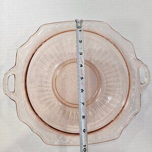 Rare find. Hard to come by. And Anchor Hocking 1930s pink depression glass. Pattern is Mayfair Open Rose. It is a large double handled serving bowl. 11.75 inches. Made in Lancaster, Ohio by the Anchor Hocking Glass Company. This pattern was pressed or molded into the glass. Mayfair was the only other mold-edged pattern besides Cameo and Princess. It had the longest production run of the three from 1931 to 1937. This bowl is in very good condition for its age. It is free of any chips or cracks clear vivid color but due to age may have some imperfections. Vintage item. Non smoking pet home.