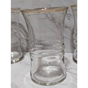Amazing set of 10, gold trimmed hourglass shaped drinking glasses. These beauties have survived since 1940 and would love to grace your table next. Due to their age there are various levels of wear in regards to the gold trim. No chips or cracks!