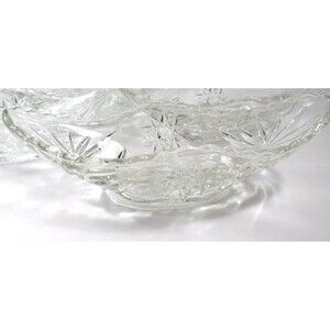 The Anchor Hocking Clear Gondola / Banana Split Dish "Star of David" is a vintage candy dish made of heavy cut glass. It features an etched pattern with a star of David design, typical of the Mid-Century Modern style popular in the 1960s. This original production piece is from the Early American Prescut/EAPC product line and was manufactured in the United States. The oval-shaped dish has one compartment and is unboxed, making it a decorative and unique addition to any table setting or collector's display.