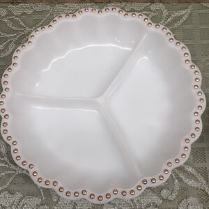 Anchor Hocking Round White Milk Glass 3 Section divided dish, 9”W X 1.75”D. with gold dot edging. Made in 1950s. Gorgeous tops with adorable undersides on snack tray. Also a pair of thumb print round dish used for mints, tea, or jewelry trinkets. -4". All preowned. No chips or cracks. In great condition.