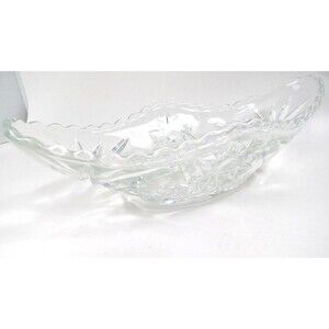 The Anchor Hocking Clear Gondola / Banana Split Dish "Star of David" is a vintage candy dish made of heavy cut glass. It features an etched pattern with a star of David design, typical of the Mid-Century Modern style popular in the 1960s. This original production piece is from the Early American Prescut/EAPC product line and was manufactured in the United States. The oval-shaped dish has one compartment and is unboxed, making it a decorative and unique addition to any table setting or collector's display.