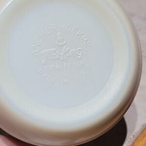 Small milk glass fire king sorbet, soufflé, small oven proof dessert bowl with tan or taupe exterior.