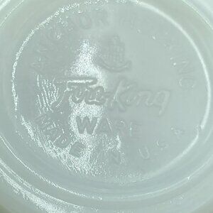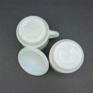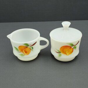 Anchor Hocking Fire King Gay Fad Fruit Peach Creamer and Sugar Bowl with Lid. Excellent pre-owned vintage condition - very clean with the pattern intact. Peach fruit pattern on white milk glass. This is a rather small set. The creamer is 2-5/8" tall and 3-1/8" across the top, 4-3/8" handle to spout. The sugar bowl is 3-1/8" round, 2-5/8" tall without the lid, 4" overall.