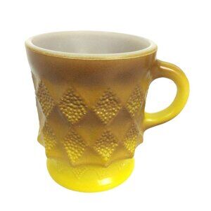 These vintage Anchor Hocking Fire King Kimberly mugs, featuring a yellow-brown diamond pattern, offer a classic aesthetic. They're oven-proof, showcasing the unique texture and durability for which Fire King pieces are celebrated.