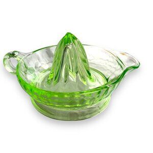Vintage uranium glass juicer in very good vintage condition. Mid Century collectible kitchen utensil. Fluoresces under a black light beautifully.