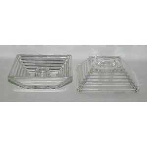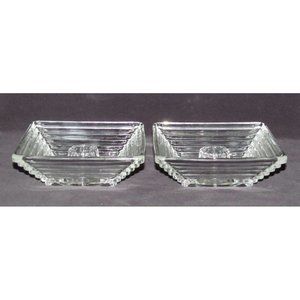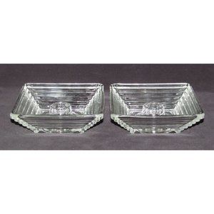 This is a nice crystal pair of square candle holders in the Manhattan or Horizontal Ribbed pattern. They were made by the Anchor Hocking Glass Co. from 1938 to 1943. They measure 4 1/4 inches across the top and 1 1/4 inches tall.