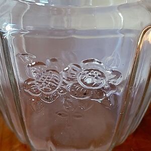This 37oz pitcher from Anchor Hocking is a beautiful addition to any collection. The Mayfair/Open Rose pattern showcases the intricate details of this pressed and fused glass piece. The clear color allows for a versatile use in any setting. Measuring at 6 inches tall, this pitcher is perfect for serving cold drinks at your next gathering.
