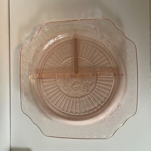 Beautiful pink depression glass grill plate by Anchor Hocking in their Mayfair Open Rose pattern. No cracks or scratches. 9.5" X 9.5"