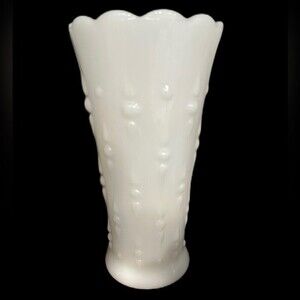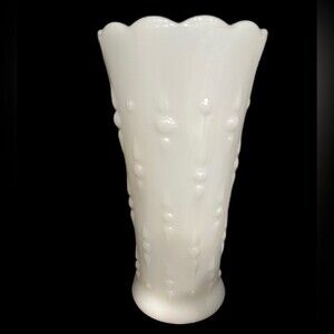 Beautiful milk glass vase that measures approx 7.5” T x 4”W .