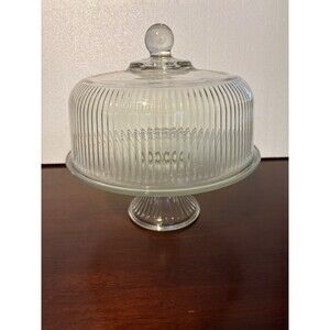The Anchor Hocking Monaco Cake Set is a vintage crystal clear glass cake stand with a ridged pattern and round shape. It includes a stand and lid, making it perfect for all occasions. The set features a textured underplate and smooth ribbed stand & cover, adding a touch of elegance to any desert display. With a diameter of 11 inches, this cake stand is dishwasher safe and weighs 8 pounds, making it sturdy and easy to use for showcasing your baked creations.
